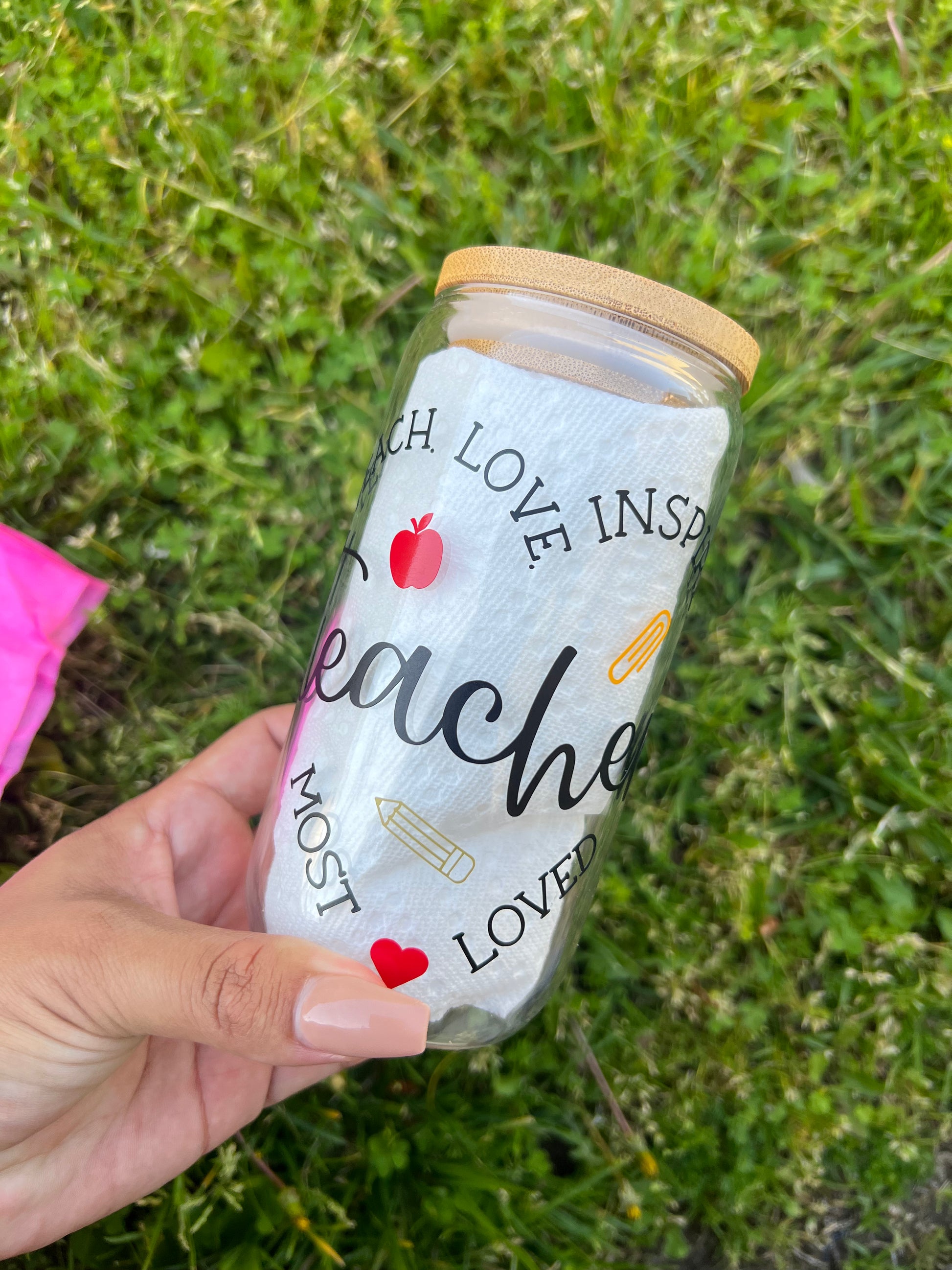 Teach. Love. Inspire. glass cup with bamboo lid and plastic straw. Perfect for students to gift to their teachers for teacher appreciation week or major holidays like Christmas or even birthdays! Your coffee or tea lover will definitely love this cup!